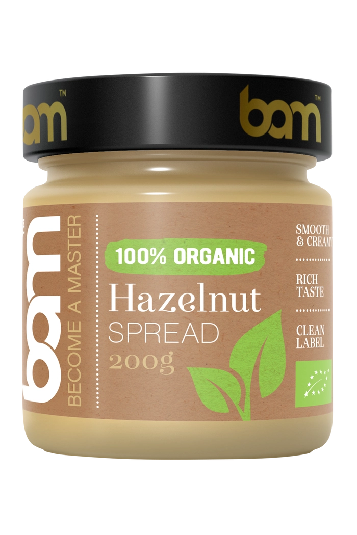 BAM 100% Organic Hazelnut Spread (200 g) is made for true nut lovers. The main ingredient is organically grown hazelnuts, which are prepared by a gentle roasting process to develop their full, natural flavour. The spread is completely additive-free - no salt, sugar or emulsifiers, containing only naturally occurring oils and sugars from the hazelnuts.