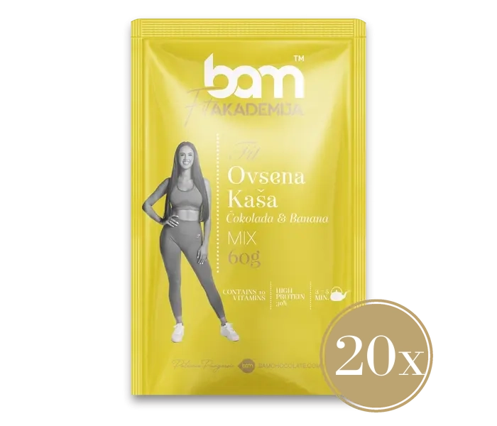 FIT Breakfast, Chocolate and Banana, contains 20 pieces of BAM Oatmeal with chocolate and banana flavour. Chocolate and banana oatmeal with added protein combines an irresistible blend of intense chocolate and the sweetness of banana to indulge you at every part of the day. With every mouthful, you''ll be treated to a flood of flavours that will delight you. Indulge in the luxury of chocolate and the authentic sweetness of ripe bananas for a rich and nutritious breakfast. This protein-rich, fibre-enriched chocolate-banana porridge is the perfect option for those who want to combine health and delicious taste in one meal. It gives you a healthy, energised start to the day.