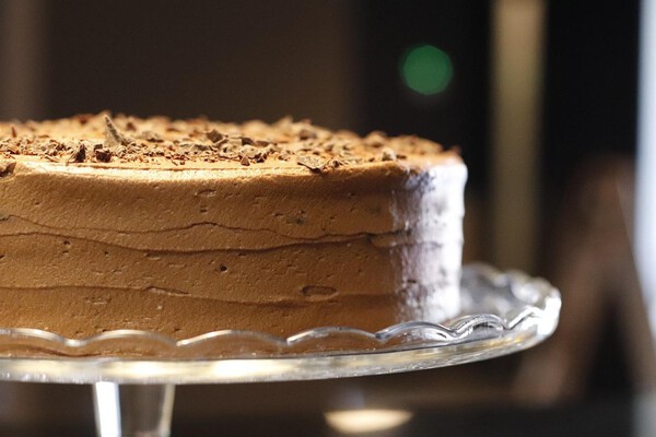 Place the sponge cake layer in a ring and moisten it with sweetened water. Place the chocolate cream on top first, followed by the ''white'' cream.
